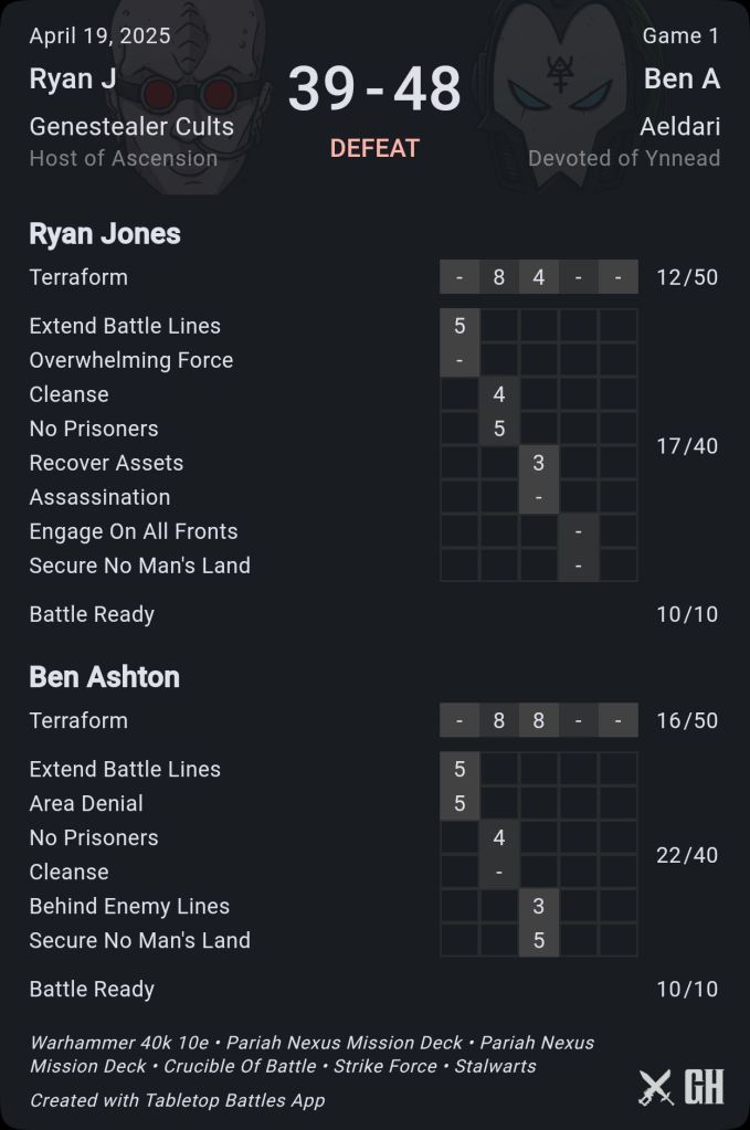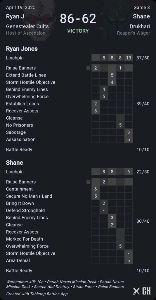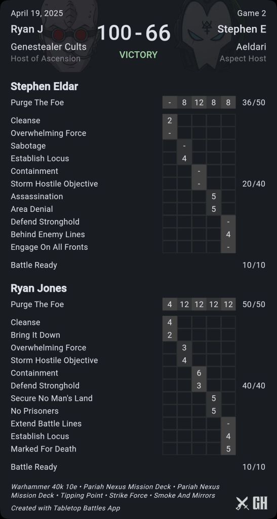The game more or less continued with this trend, I was able to score secondaries very well due to being GSC, and played very aggressively to keep up on Purge the Foe. Stephen wasn’t able to screen me out very well due to being low on resources so my 6″ Deepstrikes put in a lot of work this game. I think GSC have a very good match up into Eldar, they are the perfect target for our profiles and we have enough flamer shots etc. to make them take just enough armour saves to get kill units very efficiently.