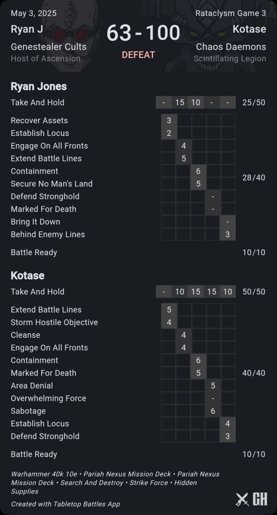 The answer to this game came to me last night as I was reflecting on my Rataclysm games because I couldn’t sleep. One of the struggles with playing this list is the desire to get ‘V A L U E’ out of my Acolyte Hybrid demolition units. It’s essentially a 140-point investment for the unit, 80-points for the character, 15-20 points for the enhancement and 2CP for 6″ DS, and crazy 5’s. That’s 260 points and 2CP, so in my mind I always need to be using the unit to at least deny/secure primary by 6″ onto the edge of a point or removing a unit on a point, move blocking, killing something big and important, AND scoring secondaries.