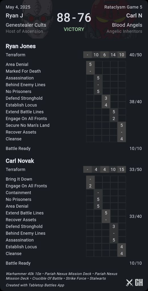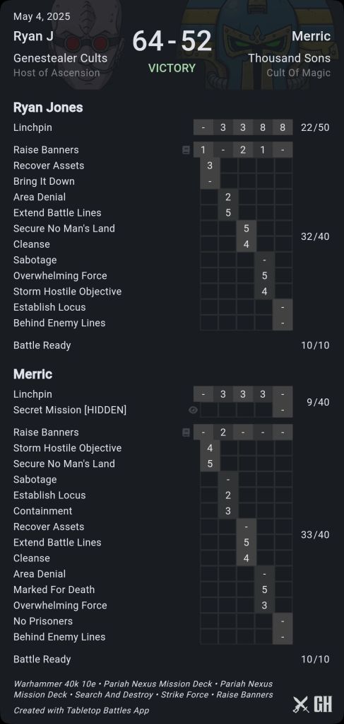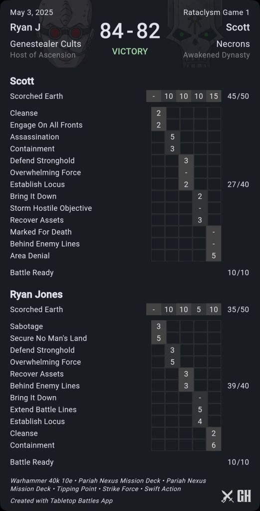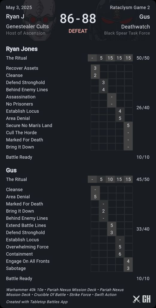 The Ritual was pretty good for me on Crucible of Battle, I created 4 objectives over the course of the game and managed to max primary, somehow. Gus let me heroic into a unit of Intercessors in turn 2 and then consolidate onto the middle objective afterwards, netting me an extra 5 for primary that turn. This put me 5 up on Gus perpetually meaning all I had to do was win on secondaries and the game was mine. I was playing Genestealer Cult? Easy right.