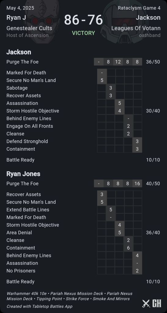 At the bottom of 4, I was set to be up 66-62, keeping Jackson to a max of 12 on primary in turn 5 + a potential 10 on secondaries giving him a max score of 82. If I could hold more, which was easily achievable, and kill just a single unit I would be at 78 and only need 5 on secondaries to win. However, I had other plans.