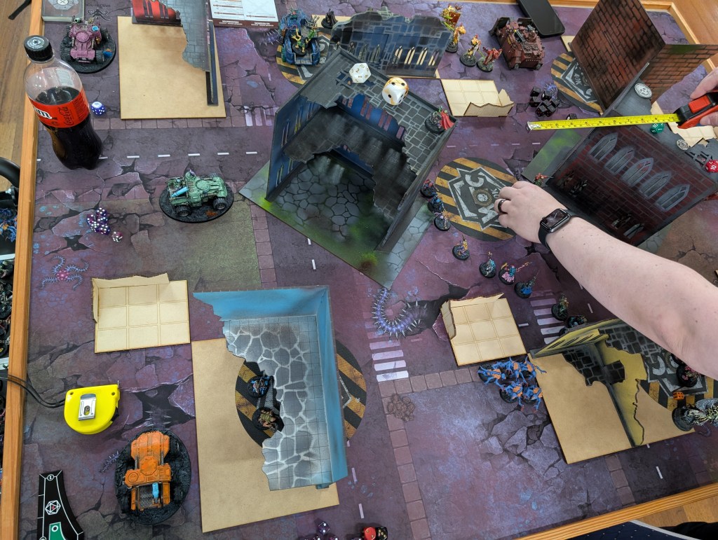 Pictured above is me being an absolute gatcha gamer by 6″ Deepstriking into a pocket in the middle of the board to contest the mid-point, stopping Carl’s Terraform and scoring with his combi-Lieutenant & Incursor’s but also throwing 4 democharges at Dante & friends, putting like 20+ wounds on them or something stupid, but Carl made enough 4+ Invulns to keep Dante alive on 4 wounds.