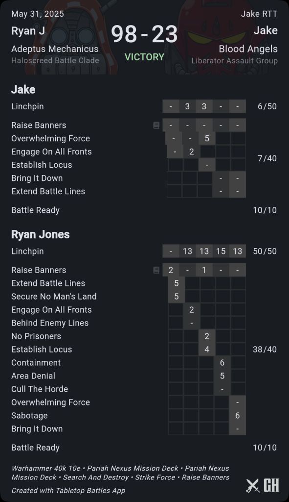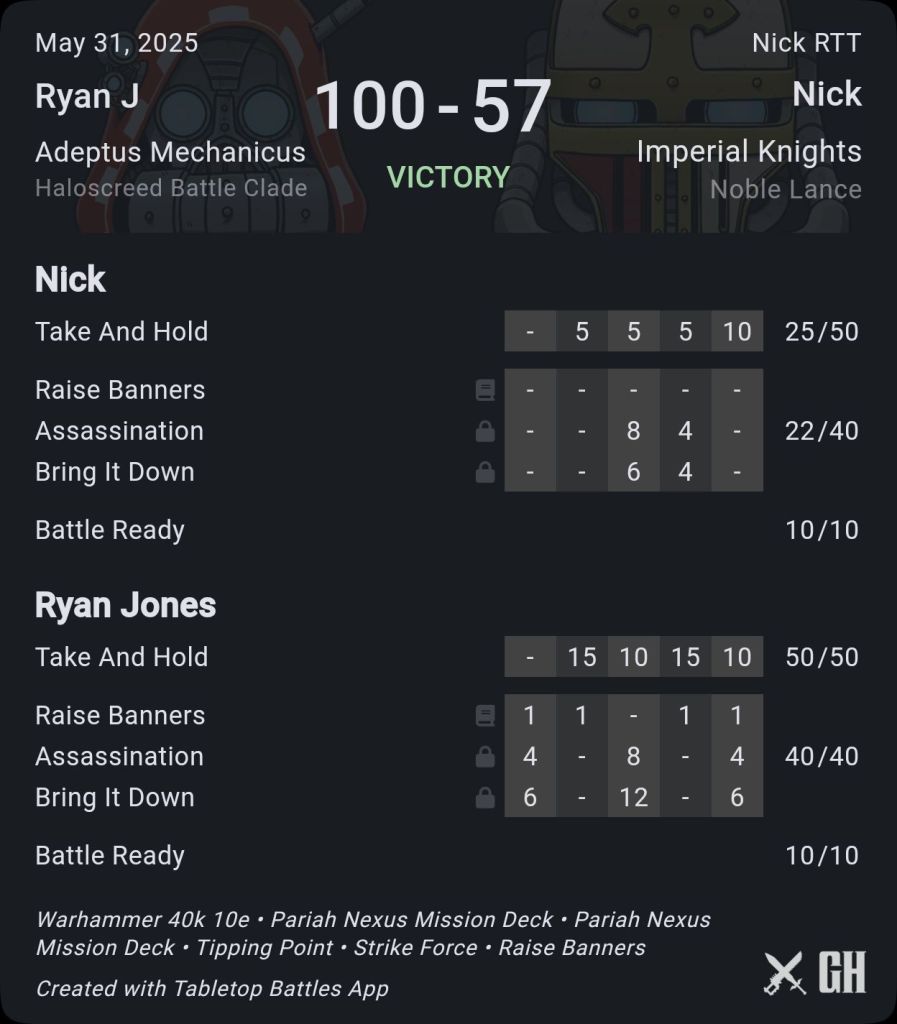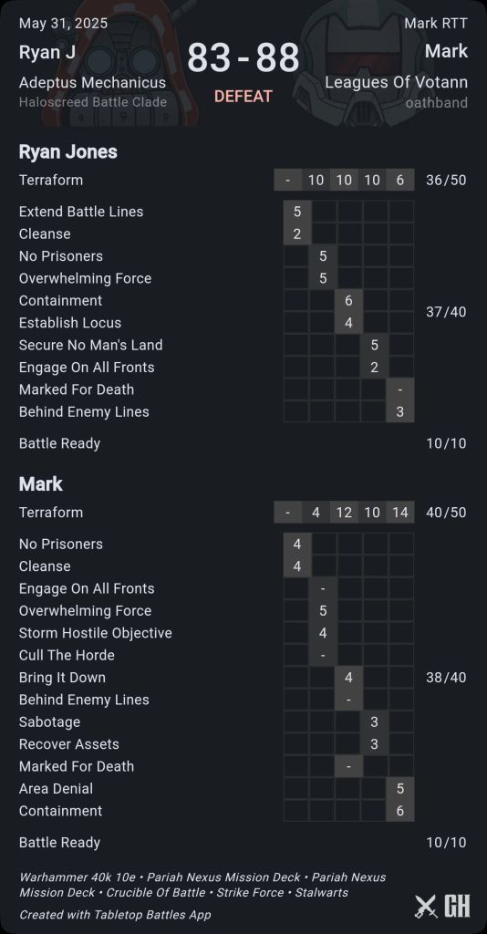 I NEVER talk games out – normally because I never go to time – dice down, is dice down, winning or losing, because honestly, who really cares. Mark did. He wanted to win, so I flipped a few secondaries, and we scored up, and I said it’s your game, have it. Had he not secured those 8 points in turn 3. I don’t think he would have been mathematically able to win.