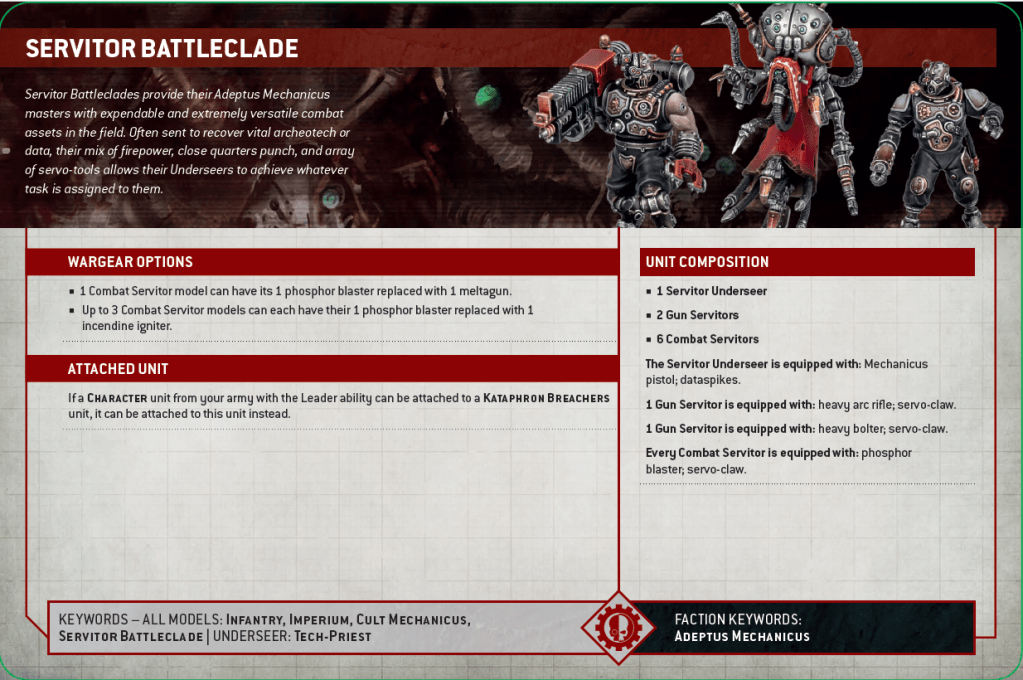 Lastly, the Ad Mech kill team rules were revealed, which also get the army rule! Excellent! It’s a mixed unit of 2 gun servitors, 6 combat servitors and a pseudo leader, the Servitor Underseer, which does not have the character keyword, but does have the tech-priest keyword which means you can give this unit certain enhancements. The loadout options are a bit weird; the whole unit is a bit weird.
