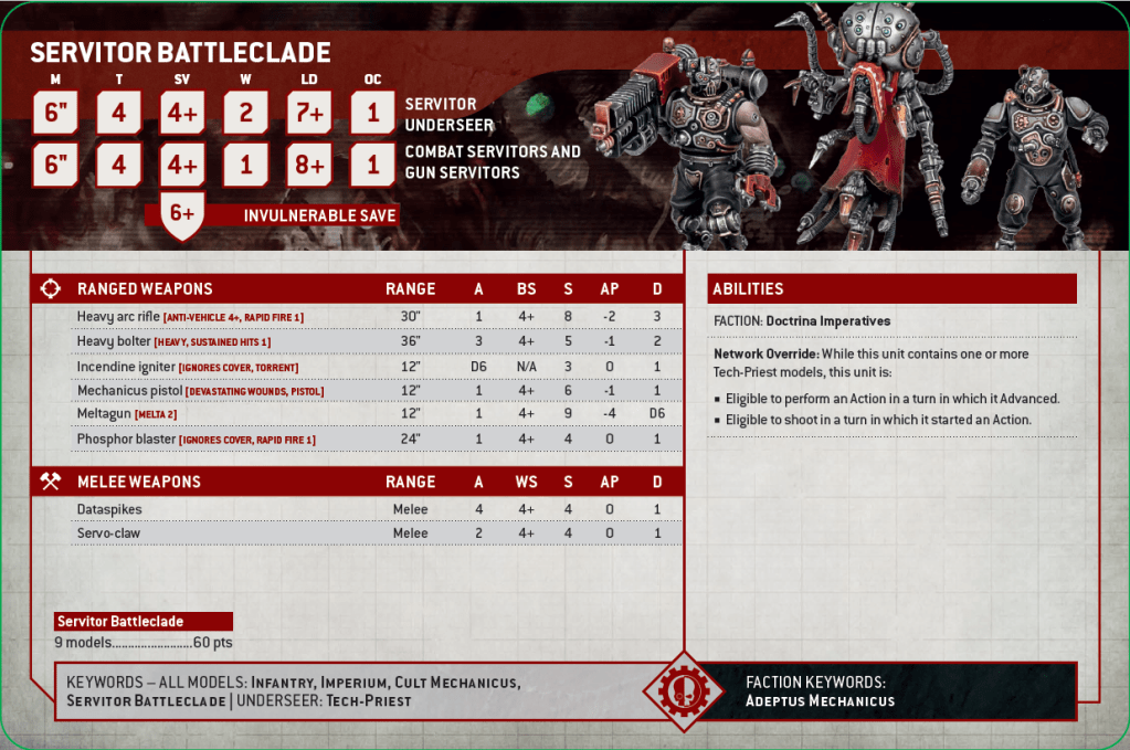 Actually, it has the cult-mechanicus keyword, which means it synergises with the detachment rule for Data-Psalm Conclave. Oh boy, I’m feeling like DPC is back on the menu boys. I just need 3 units of this kill team which I probably won’t be able to get until 11th edition.
