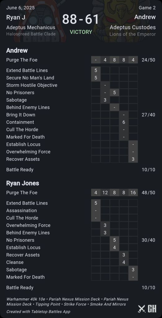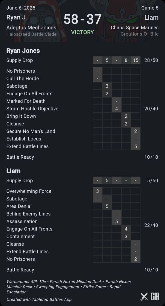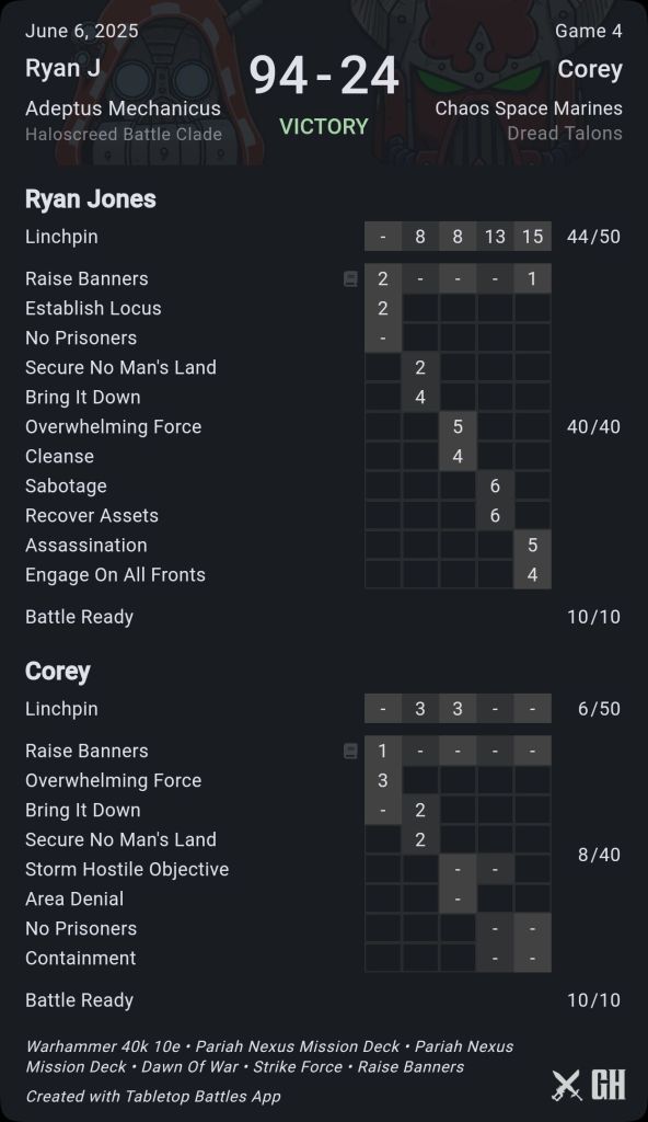 Thank you for the game Corey, you’ve inspired me to finally re-base all my CSM models and run Dread Talons and an upcoming team’s event. This does mean I’m going to cherry pick all the 7+ leadership match ups. I hope my teammates don’t mind.
