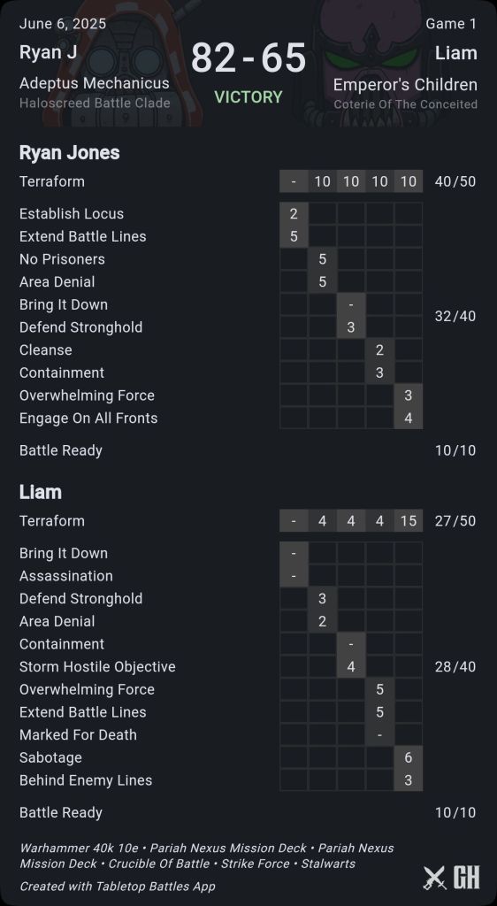 EC doesn’t really keep any models in deepstrike/reserves, and although they move quite fast, he didn’t put anything within effective threat range of my no-man’s land objective. I also kept him pinned back by throwing my entire army at him so he wouldn’t be able to score any primary until the final turn of the game.