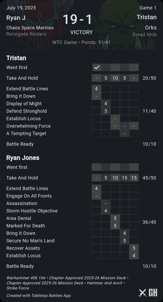 I yeeted in this game, and although I had a pretty banger turn 2, I whiffed a bit, and car parked my models too much that the crack back secured the W for Mason.