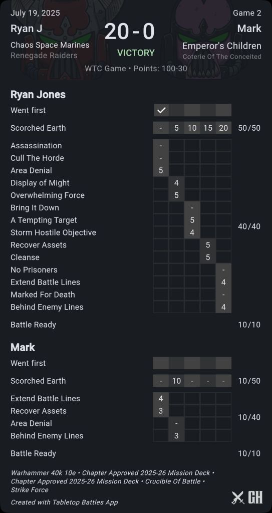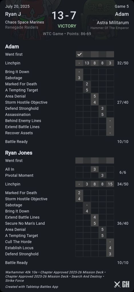 Ultimately, this game was close until it wasn’t. Adam made some great plays, but the dice were on my side. He rapid-ingressed a unit of Aquilons to make a play and take my home objective, forcing me to 3 points on primary in the following turn. However, my Daemon Prince was within 12″ of this unit, and I rolled an 11 on my charge, making it in and picking up the unit.