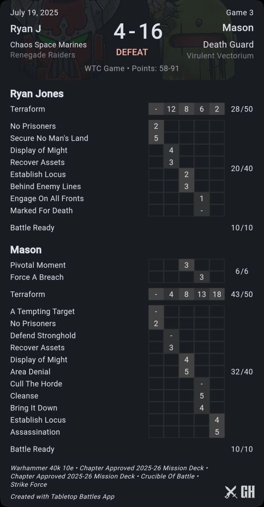 I can’t really remember how the pairings went for this round, but I’m fairly certain I was a defender and jumped on the DG grenade to save my team. I think Votann would have had a good match up into DG but they were busy absolutely bodying CSM.
