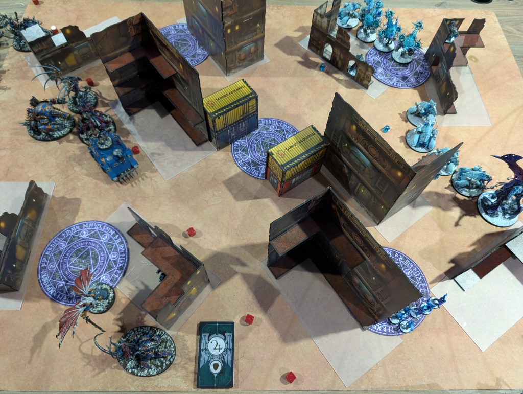 Despite his alright position, during my T2 Mason auto-exploded an MBH which could have killed his LoV on 2 wounds, allowing a Discolord to charge a Drone and consolidate into another unit of MBH on his home objective. But he only did 1 mortal to the LoV, and it made its FNP roll.
