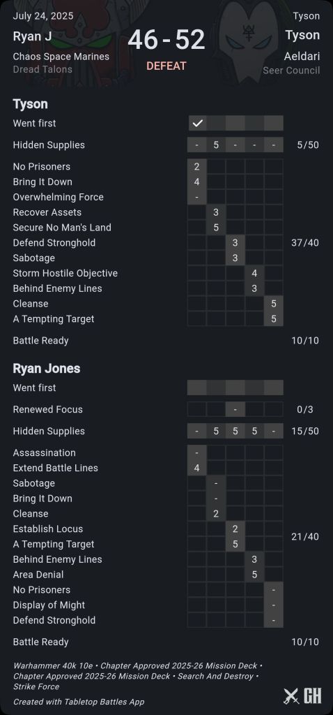 It felt very difficult to play CSM after the shenanigans Renegade Raiders has. Ultimately, it was still a close game as the Eldar were unable to contest primary, I probably shouldn’t have moved Vashtorr, but if I made my 4+ it would have been funny.
