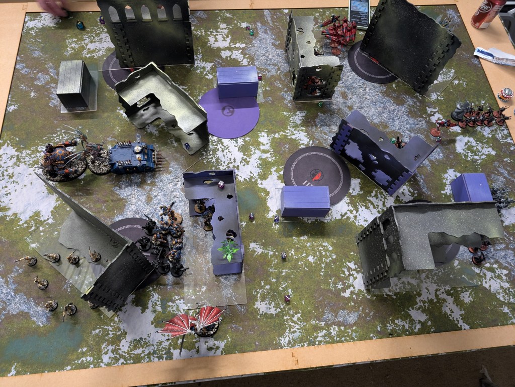 He drew no prisoners and bring it down, immediately repositioning a unit of Dark Reapers let by Maugan Ra and killing my Daemon Prince, big sad. Realistically, I don’t think I could have deployed anywhere productively where he wouldn’t be able to do this to my vehicles turn 1 on this deployment and terrain but it was still a little bit poo.