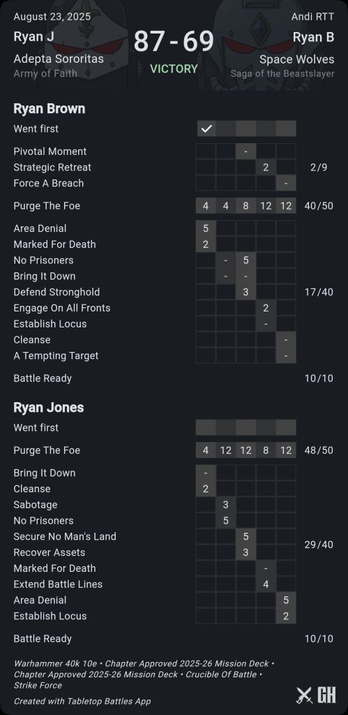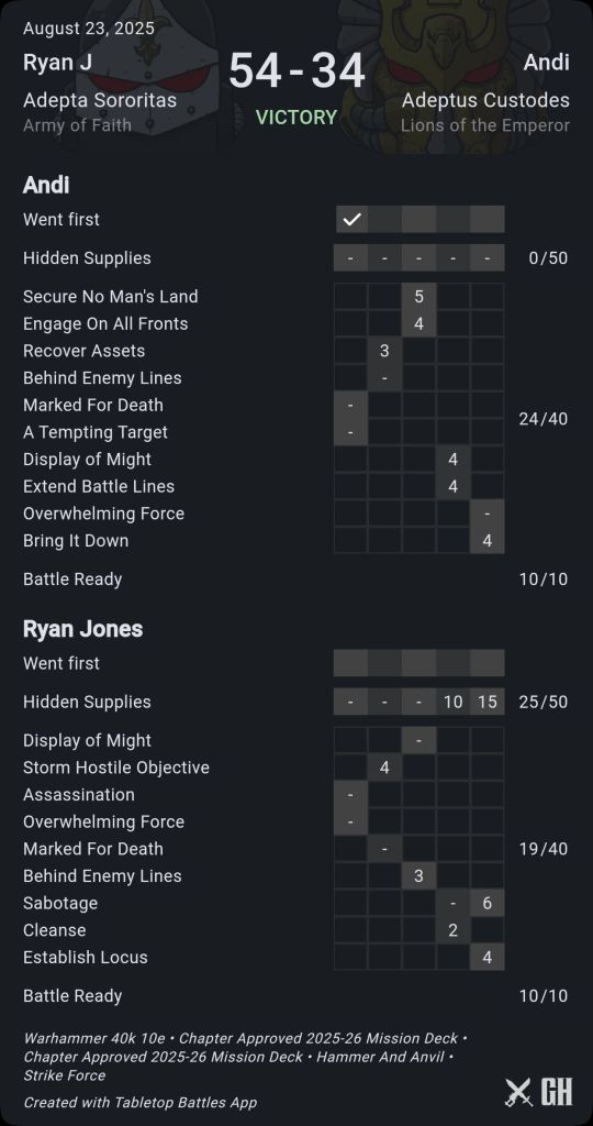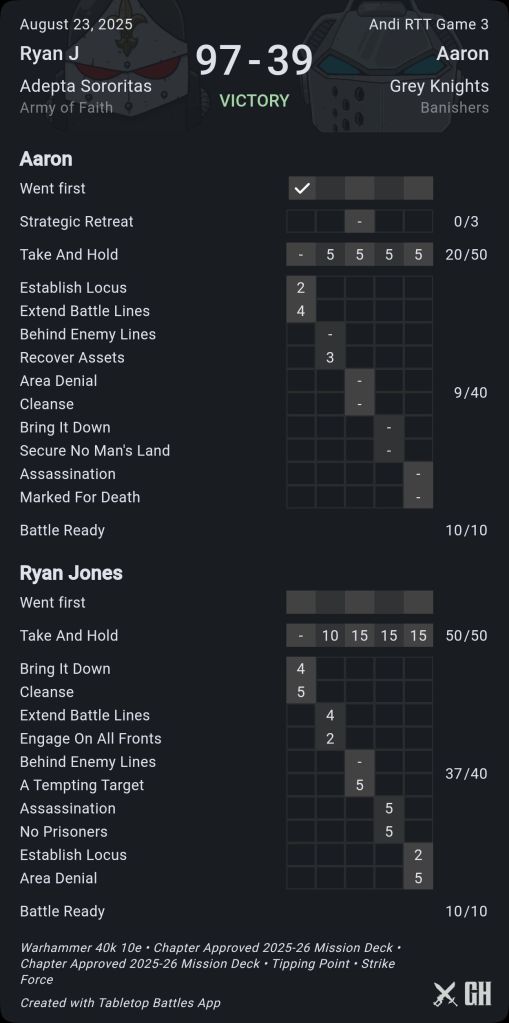 Going second was neat; my secondaries were piss but I was having a whale of a time. Being back on Sisters felt, right. But after playing AdMech for like a year, literally playing anything else feels fantastic.