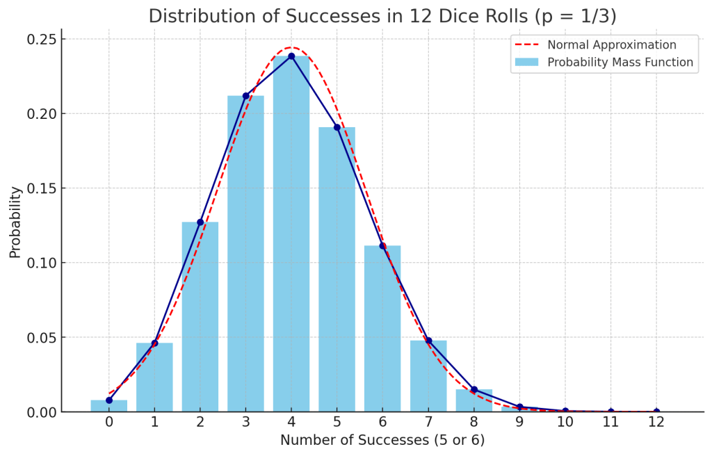 This, again, is of course only data for a single dice roll. What if we applied this to let’s say, 12 dice. As dice rolls are considered independent of each other, we can use a binomial distribution for this calculation. This is a fancy way of saying multiplying the probability by the number of dice.