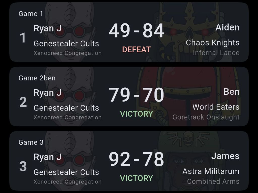 I chose to play Genestealer Cult at this event using the Xenocreed detachment. It’s what I plan on playing at a GT in January and wanted to start getting Reps in. This won’t be the final list for Jan and there are some changes that I’d like to make but I’ll write an article about that later, maybe. There were 44 people in attendance at this RTT, so it felt more like day 1 of a GT which was fun.