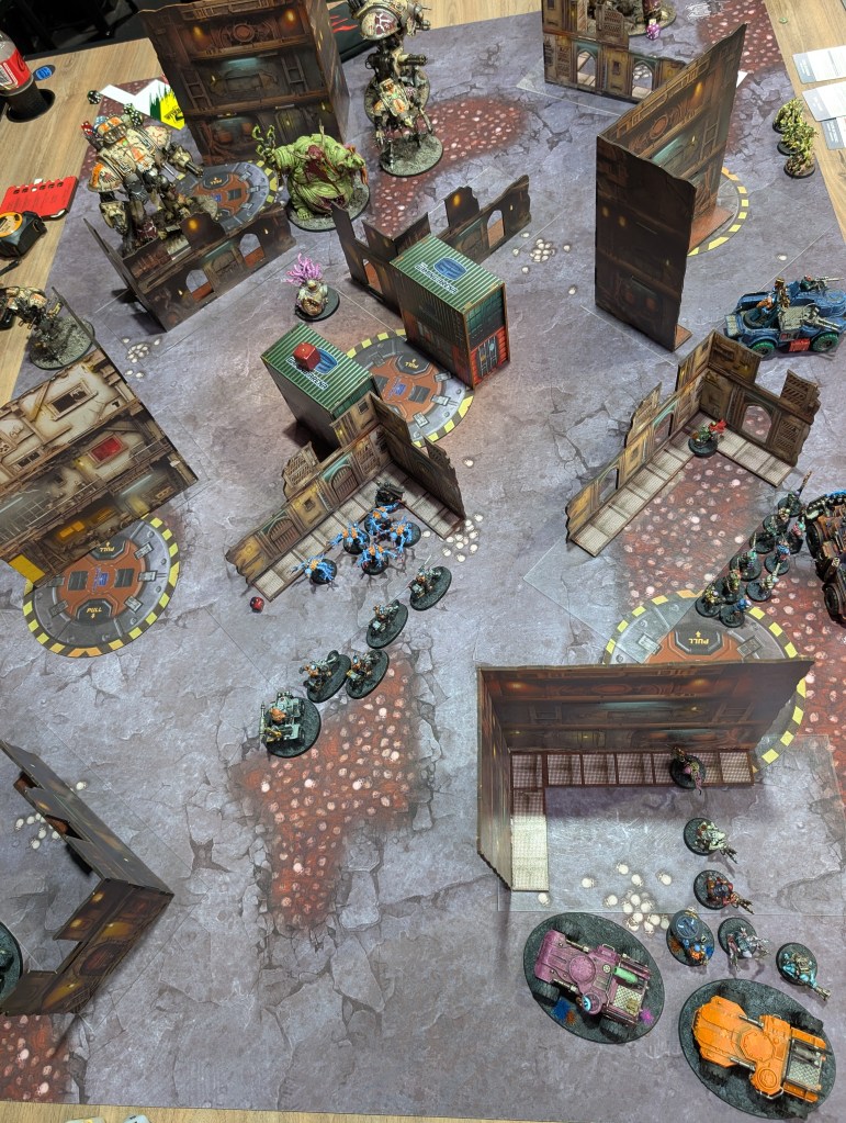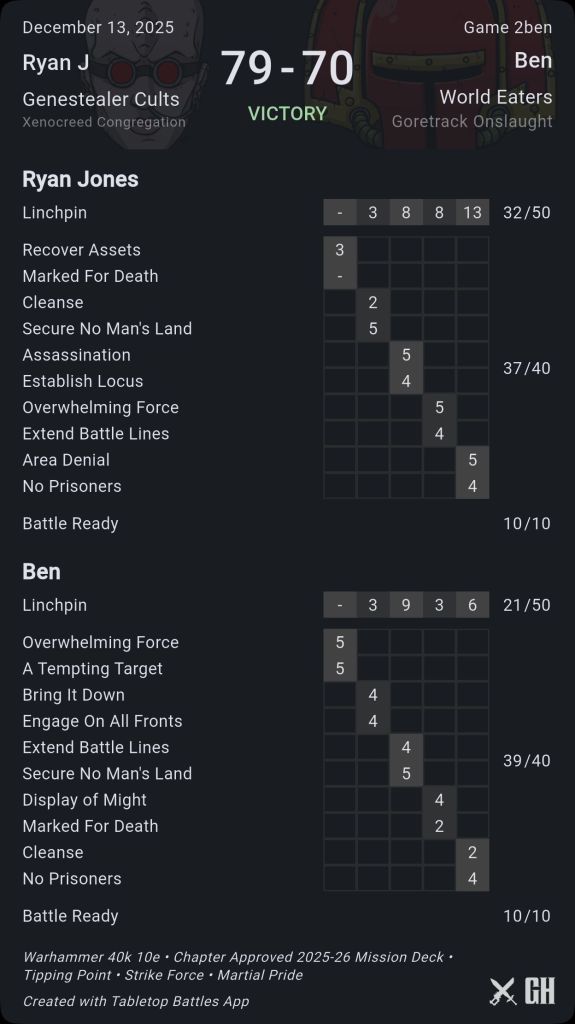 It wasn’t a great game for Ben, if he had more Spawn in his list, it would have been more amenable. He was forced to trade big expensive units to destroy trucks and scoring pieces while I was almost always trading up while going back into him. I was able to effectively play around his blood surges and without the Jakhals protecting his deployment zone I used rapid ingress on some Tool Acolytes into his backline to destroy the Forgefiend on his home objective. I put some bikers back there too for Establish Locus turn 3, and on turn 4 after his other Forgefiend turned around to take back his home objective, the bikers combined movement mortals, a grenade and a single Las cannon shot took down the second Forgefiend, lucky boy.