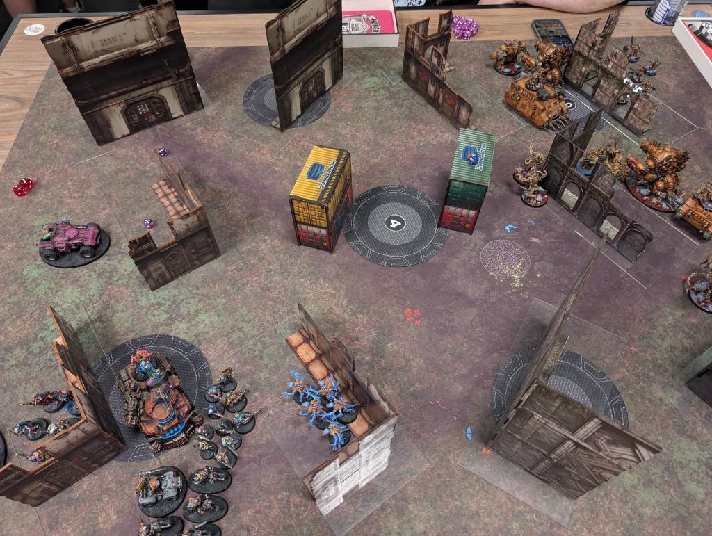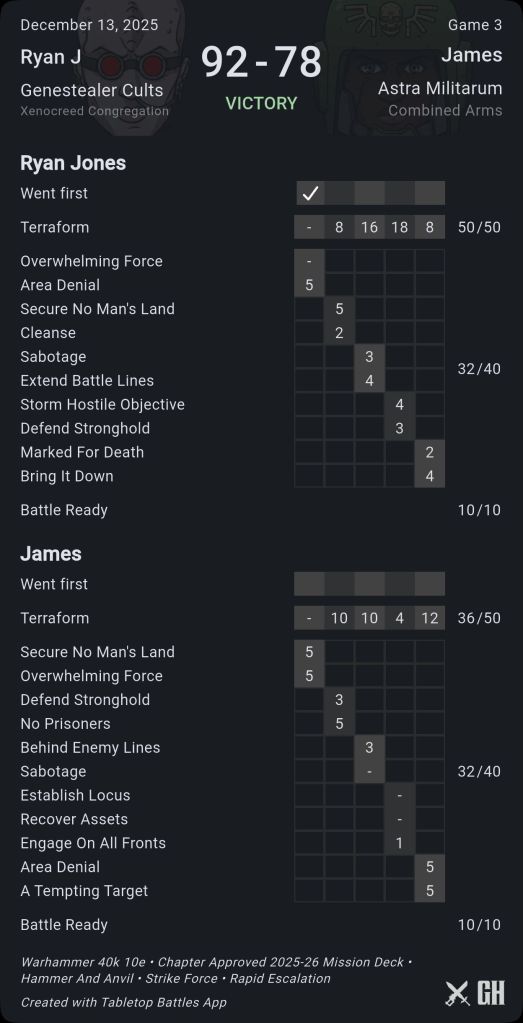 I had enough other trash to keep him from deep striking in my half of the board. James did an excellent job of scoring secondaries but simply couldn’t contest any primary after turn 3 when his Taurox’s and other infantry units were gone.
