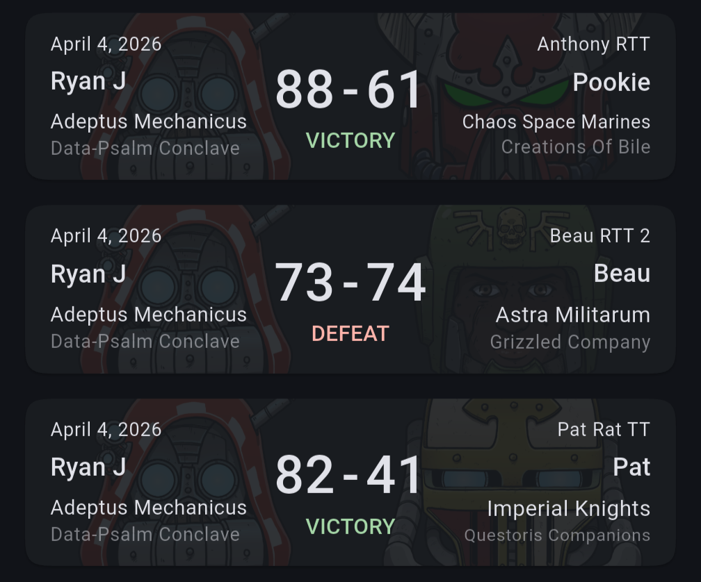 Game 2 was into AM, lost by a point, but was down 10 for battle-ready. If I had won this game, it was likely I would have gotten a more challenging pairing turn 3 and went down anyway. Had I scored the 92 in round 1 for battle-ready I would have probably lost round 2 given the other players in attendance. The list still felt fine though. I was able to effectively trade with the AM army – which was mass infantry – and make it challenging for him to engage.
