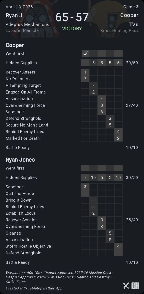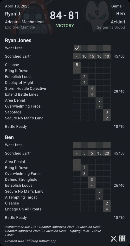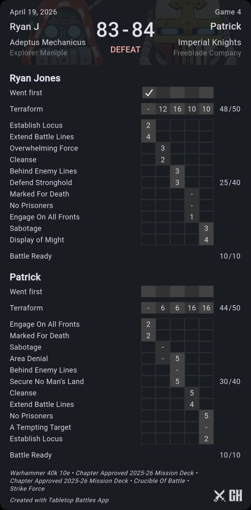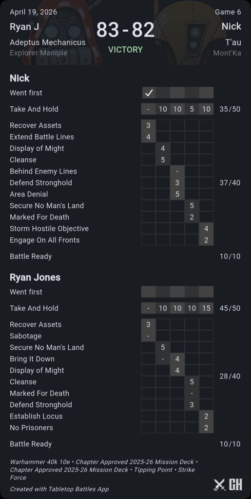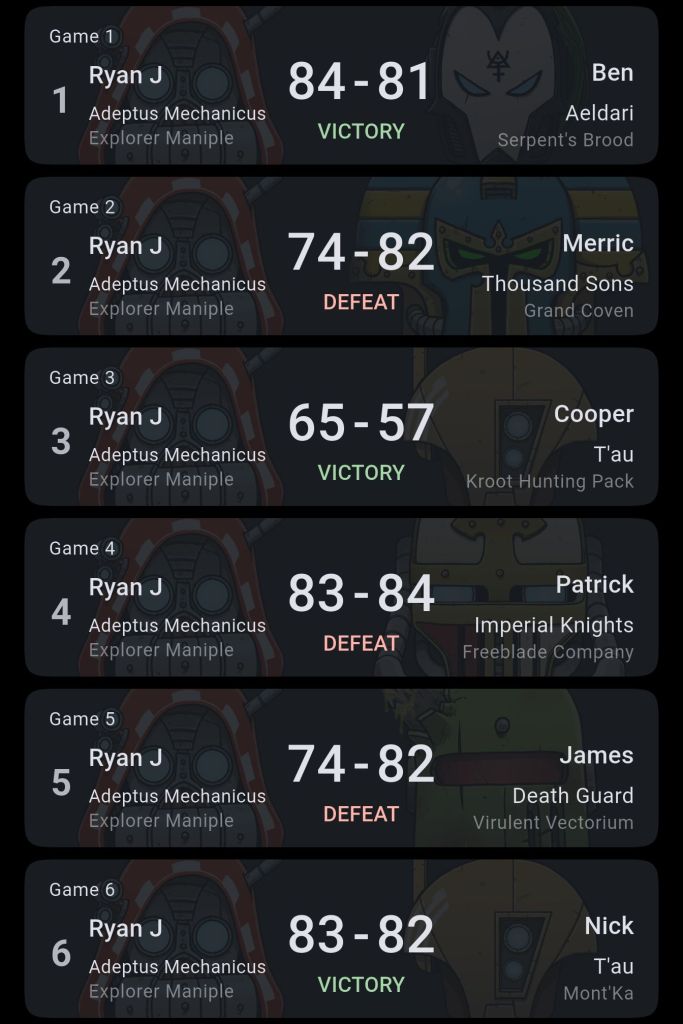This game was definitely closer on the score than it probably should have been. I went looking for data to demonstrate that Ad Mech actually has a tough matchup into DG but couldn’t find any. Guess it’s just a skill issue. Although, according to the tabletop battles app, the 6 previous games I’d played into DG I had a 100% WR going second.