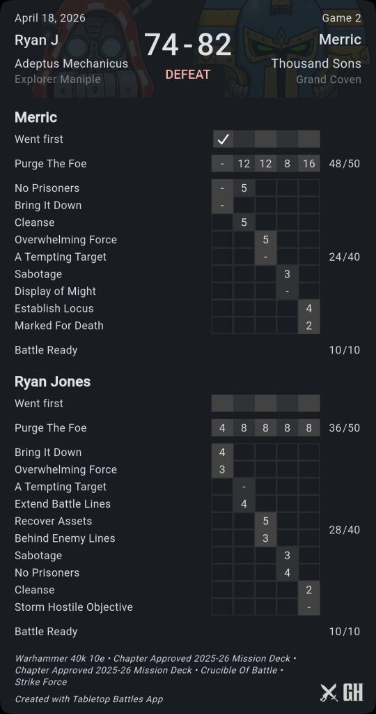 Merric ended up running away with the primary scoring from here with his remaining Rubric units but was a bit let down on secondaries making the game closer than it should have been. Still, I was happy with 74-82 against a great player with a list/detachment I’d never played before into a practiced and competitive thousand sons list. I’d hate to think what the score would look like if I went first, lol.